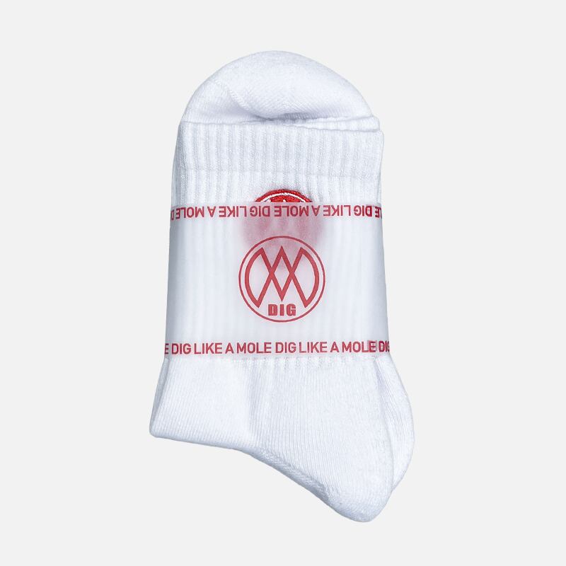 ホワイトボディにDIGMOのオフィシャルロゴを刺繍した、シンプルかつ存在感のあるクルーソックス。